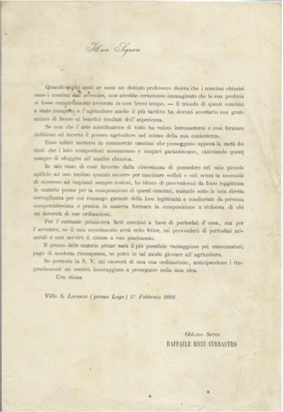 Lettera circolare di Raffaele Ricci Curbastro agli agricoltori della zona per presentare i perfosfati prodotti dalla sua azienda
