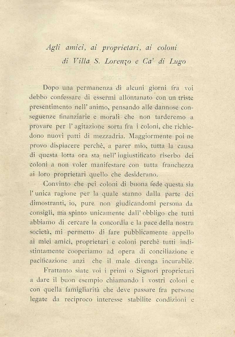 Pure non giudicandomi persona da consigli, ma spinto unicamente dall’obbligo che tutti abbiamo di cercare la concordia e la pace della nostra società, mi permetto di fare pubblicamente appello ai miei amici, proprietari e coloni perché tutti indistintamente cooperiamo ad opera di conciliazione e pacificazione anzi che il male divenga incurabile